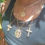 Juego de collares en capas con medalla de la Virgen y cruces brillantes.