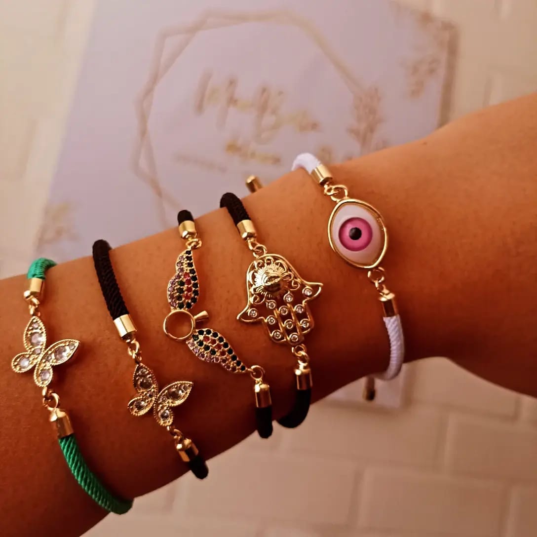 Pulsera de hilo negro con mano de Fátima (Hamsa) dorada y cristales.