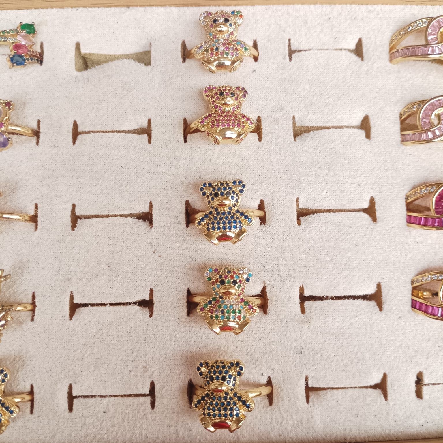 Tierno anillo con rostro de osito cubierto de cristales de colores. Alegre y juvenil.