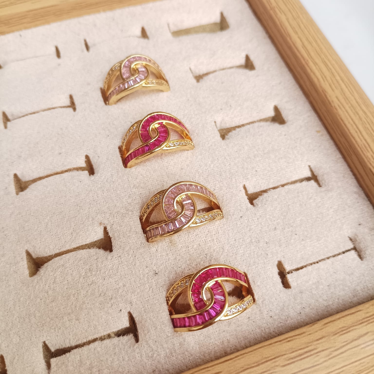 Sofisticado anillo con diseño de ondas entrelazadas y piedras corte baguette rosa intenso.